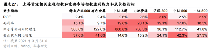 对比上游资源相关主题指数和重要市场指数的盈利能力和成长性指标,如下表所示。2021年Q1稀土产业指数与相关主题指数单季度ROE(非年化)较接近,毛利率和归母净利润同比增速高于500有色金属但低于中证上游和内地资源,营收同比增速低于500有色金属但高于中证上游和内地资源。