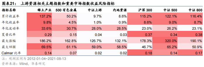 计算统计区间内(2012年1月4日至2021年8月13日)指数收益风险指标,稀土产业指数年化收益率高于其他相关主题指数及重要市场指数;夏普比率、最大涨幅、Calmar比率表现优于其他上游资源相关主题指数。