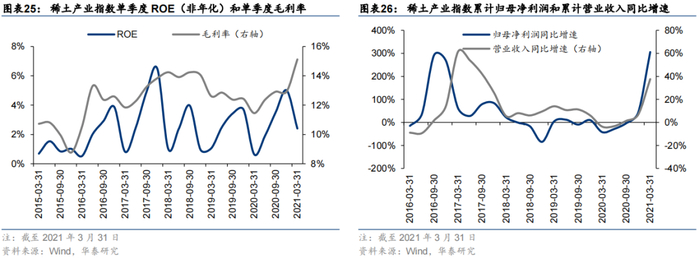 考察稀土产业指数盈利能力。指数单季度ROE(非年化)和单季度毛利率如左下图所示,2021年Q1单季度ROE2.4%,毛利率15.1%。指数毛利率在2016年经历一轮提升,2017年以来维持在指数发布以来相对高位,2021年Q1创出2015年以来新高。