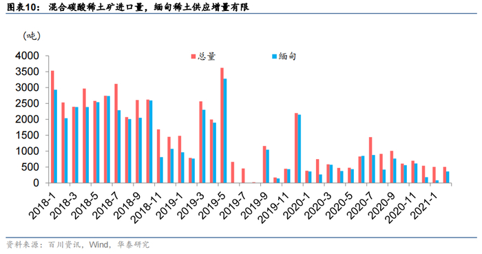 国内环保政策常态化,缅甸疫情下供给扰动加大,中重稀土供应增量有限。受环保法规的影响,江西省内中重稀土矿自2016年以来就一直处于关停状态。为了满足下游需求,我国开始从缅甸进口重稀土矿。中国2018年从缅甸进口稀土氧化物约为2.6万吨,与中国中重稀土开采配额相当。此后,从缅甸进口稀土矿持续减少,2019年缅甸多次封关导致进口量减半,2020年疫情、传统雨季、滥开滥采导致高品质的优质资源锐减等因素导致缅甸混合碳酸稀土进口量再减,缅甸稀土供应增量有限。