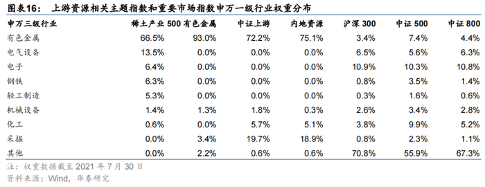 对比稀土产业与其他上游资源相关主题指数及重要市场指数申万一级行业权重分布。如下表所示。稀土产业指数相比其他三个相关主题指数低配有色金属、采掘,高配电气设备、电子、钢铁、轻工制造。由此可见,稀土产业指数并非简单投资于资源类企业,而是突出“产业”属性,覆盖整个稀土产业链的上下游。