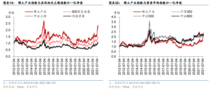 考察稀土产业相关指数及重要市场指数近期表现。如下面两张图所示,净值绘制起始日期为2012年1月4日,以该日为基准进行归一化处理。统计区间内(2012年1月4日至2021年8月13日),稀土产业指数收益表现优于其他上游资源相关主题指数,显示出稀土赛道在上游资源板块中的独特优势。在新能源汽车行业持续高景气度的背景下,作为新能源产业链的上游板块,稀土产业指数近半年表现突出,净值超越沪深300、中证500等市场指数,显示出较强的爆发力。