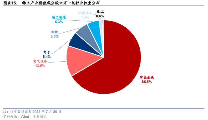 中证稀土产业指数(指数代码:930598;指数简称:稀土产业)于2015年3月2日由中证指数有限公司发布。该指数由稀土开采、稀土加工、稀土贸易和稀土应用等业务相关上市公司证券组成。指数采用自由流通市值加权,并对权重样本和非权重样本分别设置15%和5%的权重上限。从申万行业分类看,截至2021年7月30日,稀土产业指数权重集中在有色金属行业,占比达66.5%,在电气设备、电子、钢铁等一级行业亦有占比;侧重于稀土(31.3%)、磁性材料(17.9%)两个三级行业,行业集中度较高。