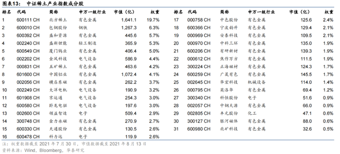 中证稀土产业指数截至2021年7月30日的成分股、对应申万一级行业、总市值及权重如下表所示(其中总市值数据截至2021年8月13日)。