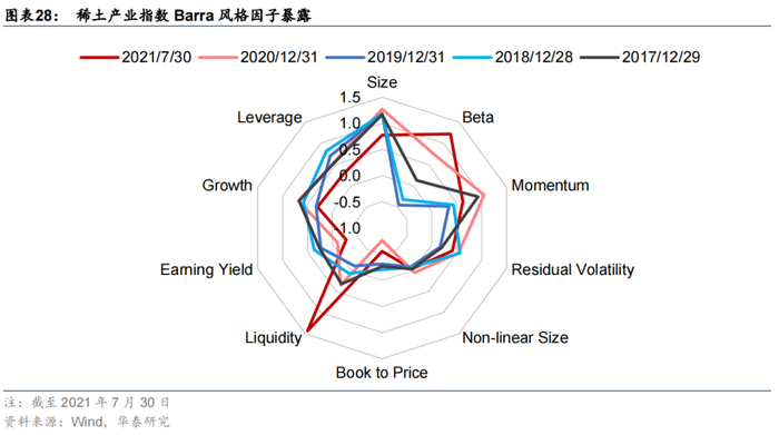 以2017~2020年末及2021年7月末为截面期,考察稀土产业指数Barra风格因子暴露。稀土产业指数长期以来风格暴露较为均衡,近期表现出鲜明的高Beta、高流动性风格。
