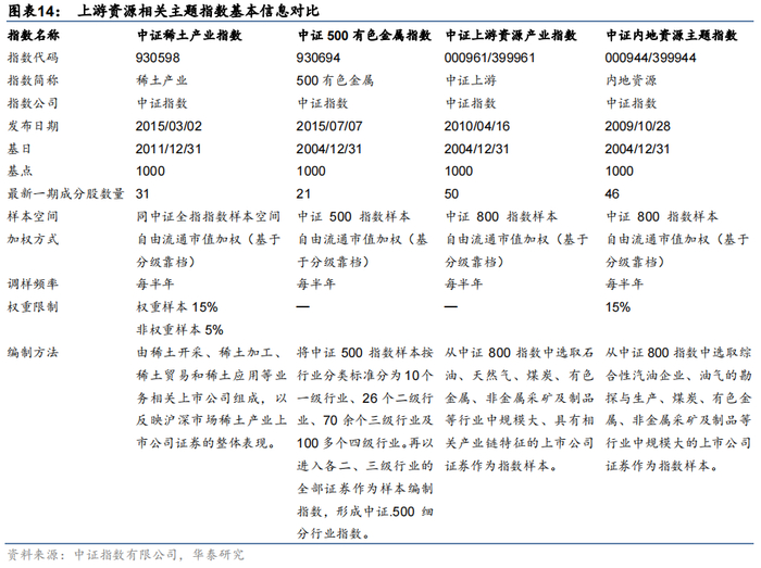 对比中证稀土产业指数与其他上游资源相关主题指数编制方案,如下表所示。其他相关主题指数包含:中证500有色金属指数(指数代码:930694;指数简称:500有色金属),中证上游资源产业指数(指数代码:000961/399961;指数简称:中证上游)和中证内地资源主题指数(指数代码:000944/399944;指数简称:内地资源)。