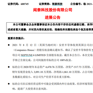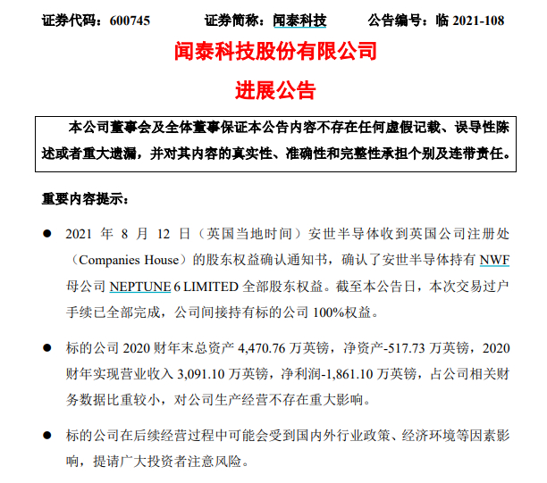 8月15日,闻泰科技发布公告称,英国当地时间8月12日,公司全资子公司安世半导体收到英国公司注册处的股东权益确认通知书,确认了安世半导体持有NWF母公司NEPTUNE 6 LIMITED全部股东权益。截至本公告日,本次交易过户手续已全部完成,公司间接持有NWF 100%权益。