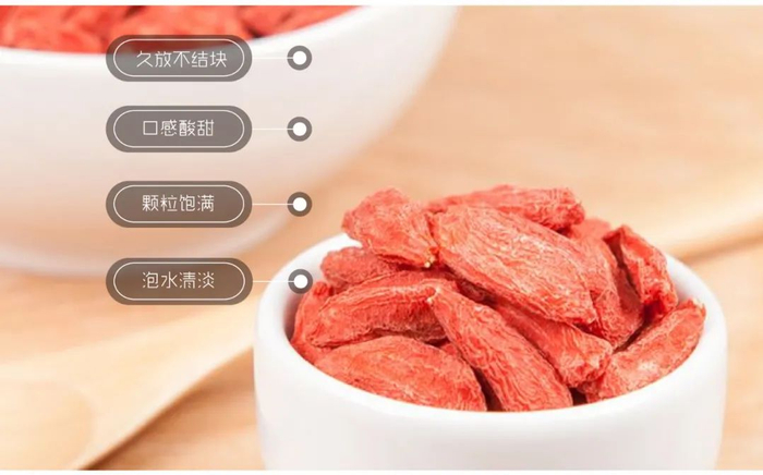 每一盒出产的枸杞经过清洗、脱蜡、制干、色选、分级、人工精选、双重灭菌、无菌包装等16道加工工艺精制而成,色泽天然、果实饱满、肉厚籽少、口感甘甜最大的保留了枸杞的营养成分。