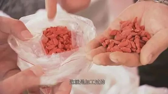 ▲自然晒干或者烘干的枸杞,表皮应该是干皱的,颜色是自然的紫红色或者暗红色,处理过的枸杞看上去红亮,表皮较为光滑,都是加过亚纳、硫磺熏过的。