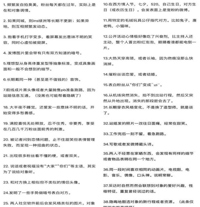 微博、豆瓣等社交软件上广为流传的《爱豆塌房指南》(部分),每次发生大型塌房事件后都会被粉丝大量转载,条条对照。