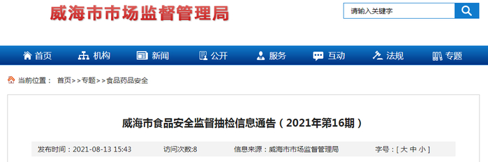 中国质量新闻网讯 近日,山东威海市市场监督管理局发布食品安全监督抽检信息通告(2021年第16期)。本期共抽检26大类食品351批次样品,其中抽检糕点20批次,经检验全部合格。具体信息如下: