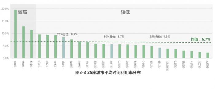 从单个公用桩的利用时间来看,有22座城市公用桩的平均时间利用率不足10%。其中,太原市的公用桩平均时间利用率最高,达到19.6%。另外成都、西安、杭州平均时间利用率也相对较高,成都、西安超过10%,杭州接近10%。