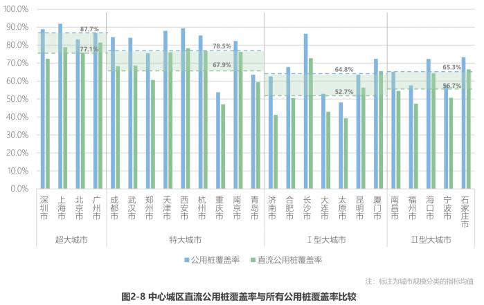 25座城市中,按城市规模来看,北上广深等超大城市的直流公用桩平均覆盖率超过77%,远高于其它规模城市。其中广州市直流公用桩覆盖率最大,为81.4%。