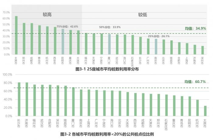 整体而言,25座大城市的平均桩数利用率并不高,仅3座城市超过50%。25座大城市均值为34.9%。