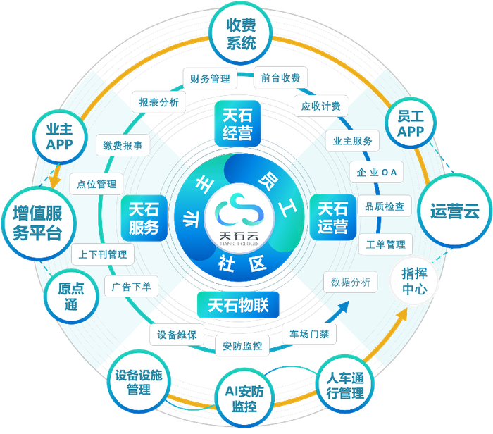 作为碧桂园服务打造的物业数字化管理云平台,天石云平台聚集数字化转型四大目标——业财一体化、管理自动化、服务在线化、社区智能化。平台功能围绕十二大场景打造,覆盖收费缴费、品质运营、业主服务、公区安防等,以提升人均管理效能、缩短服务响应弧长、提升社区增值收入。