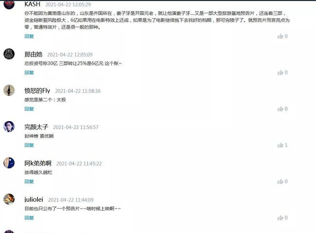 “你不能因为黄渤是山东的,山东是齐国所在,姜子牙是开国元老,就让他演姜子牙....又是一部大型旅游基地预告片,还连着三部,资金链断裂风险极大,6亿如果用在电影特效上还成,如果是为了电影继续拖下去找好的档期,那可完犊子了。就预告片而言亮点为零,普通特效片,还是很一般的那种。”
