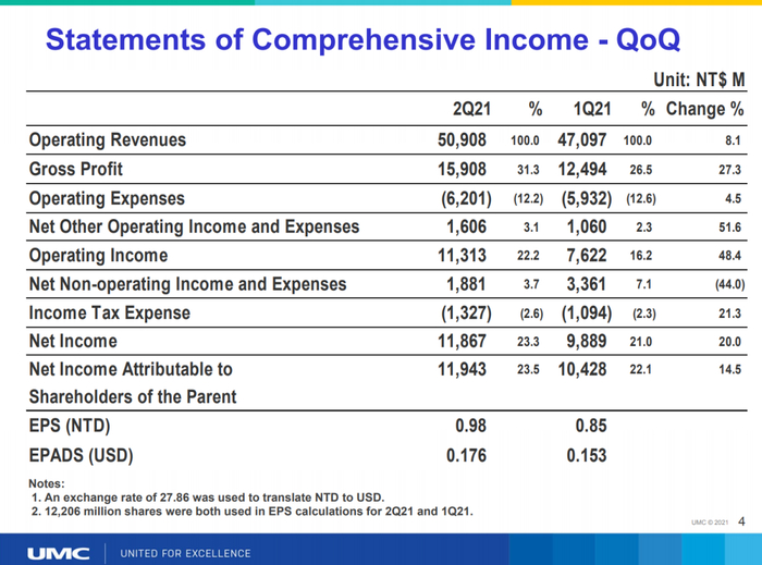 21Q2:21Q2晶圆出货244万8英寸当量,收入509亿新台币,环比增长8%;毛利率也提升至31.3%,主要得益于1)更高的出货量;2)ASP提升。归母净利润119亿新台币,归母净利率23.5%。EPS0.98新台币;Q2产能利用率100%以上。