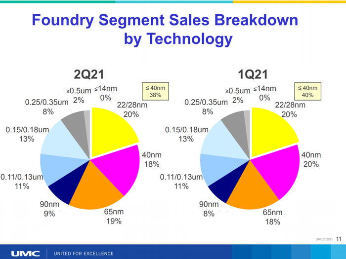按制程分,40纳米以下收入占比38%,28纳米由于100%的产能利用率,收入占比约20%,与21Q1相似。