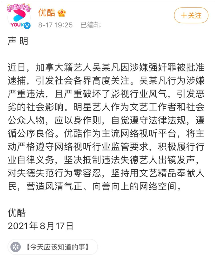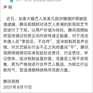 吴亦凡涉嫌强奸罪被批捕后,今天傍晚,国内三大视频平台腾讯、爱奇艺、优酷先后发表声明,下架吴亦凡参演的影视综艺节目,坚决抵制违法失德艺人出镜发声!