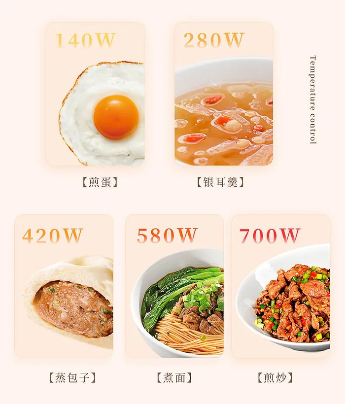 考虑到不同的菜对温度要求不用,顽米设计了5个档位,从低到高不同需求都能满足。