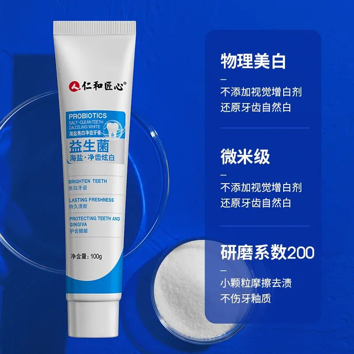 此外,仁和海盐净齿炫白牙膏,在不添加视觉增白剂的前提下,提升技术;将牙膏中的小颗粒控制在研磨系数200,微米级,更能深入缝隙,物理美白又不伤牙釉。