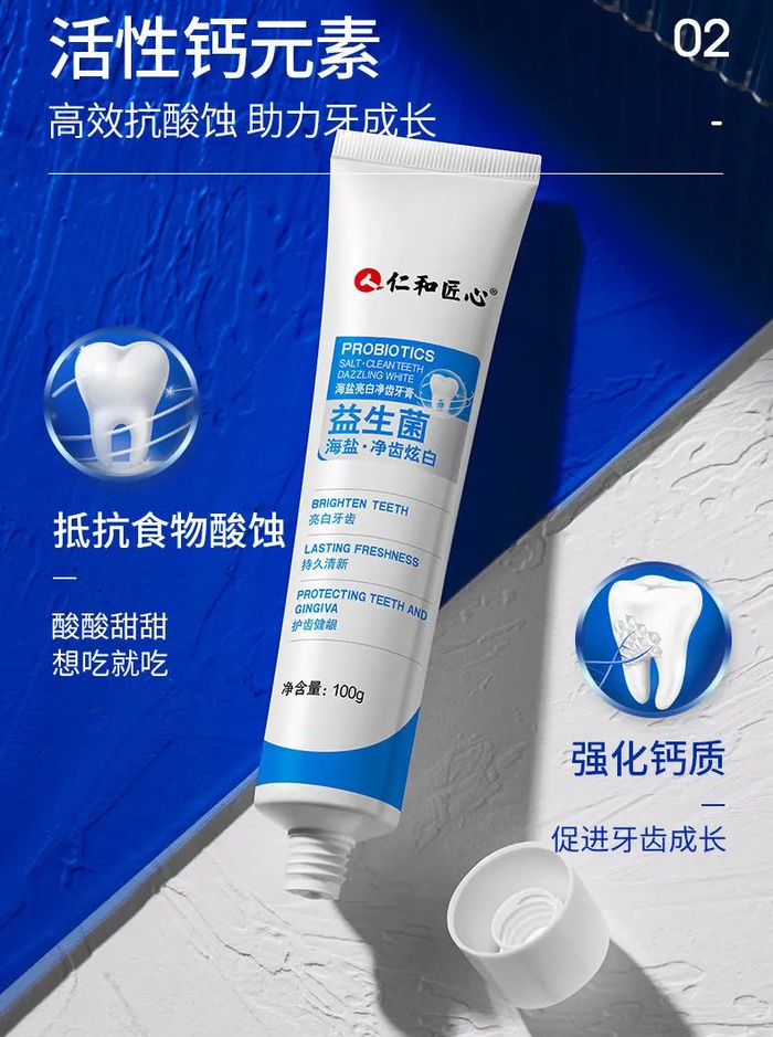 仁和海盐净齿炫白牙膏,富含活性钙元素,这些营养成分进入口腔后,不仅能高效抗酸蚀,还能帮助修复牙釉质,强化钙质,让牙齿更加牢固。