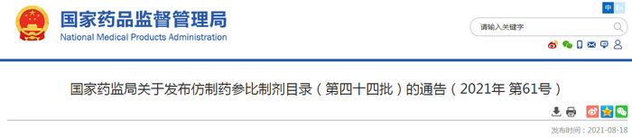 国家药监局关于发布仿制药参比制剂目录(第四十四批)的通告(2021年 第61号)