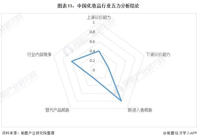 从五力竞争模型角度分析,我国化妆品行业上游主要为原材料行业和包装行业,下游需求产业主要是商品流通行业,化妆品对上下游议价总体较弱。我国化妆品行业的潜在进入者主要为国内药企和国外化妆品企业,潜在进入者威胁较大;我国化妆品行业的替代品主要为美容保健品,替代品威胁较小。