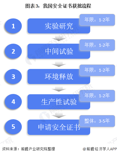 根据我国现行种子法规定,转基因种子上市前需要经历安全正式获批及种子审定上市两个阶段。在获取安全证书阶段分为五个流程,分别是实验研究、中间试验、环境释放、生产性试验和最终的申请安全证书,整体申请安全证书的周期较长,为3-5年。在拿到生物安全证书后,还通过品种审定和获得种子生产和经营许可证,才可以进入商业化生产应用。