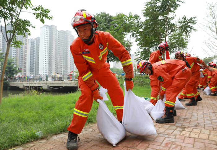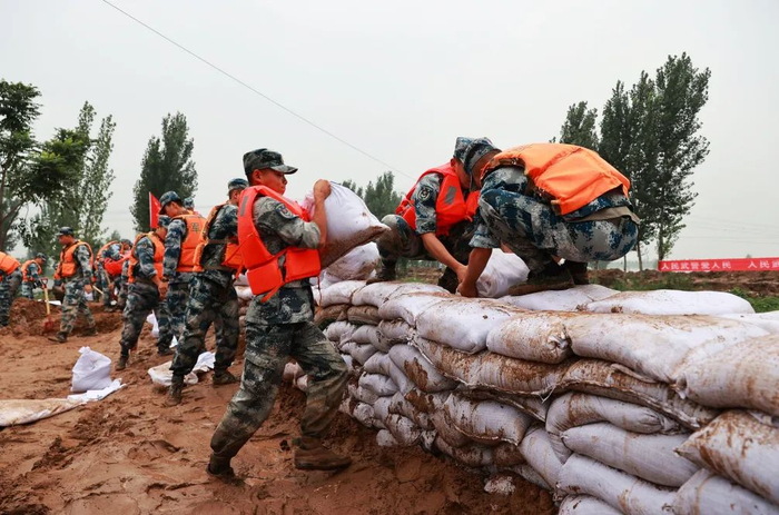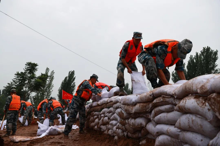 “党旗红”“迷彩绿”“火焰蓝”“城管蓝”“志愿红”……在党的坚强领导下,大汛大灾中干群齐心、军民携手筑起“钢铁长城”!危难时刻,人民子弟兵闻“汛”而动、挺身而出,1200名官兵、710名民兵、6200余名退役军人,24小时坚守一线,加固堤防、转移群众。