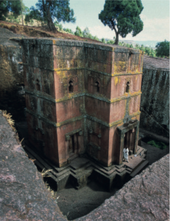 埃塞俄比亚的岩石教堂是在一座火山凝灰岩小丘中凿刻出来的,站在坑底朝上看,基本上就是一座朴素的罗马式建筑。但是从上往下俯瞰,效果大不相同——一个凿刻进大地之中的庞然大物,渐渐消失在昏暗的深坑中。