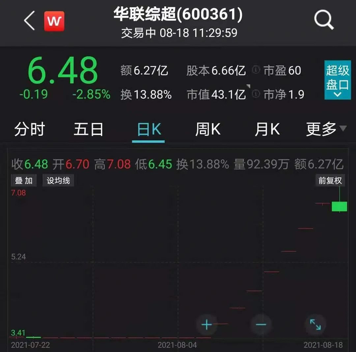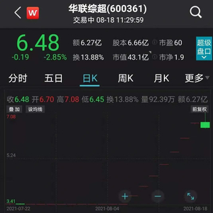 8月17日晚间,华联综超发布风险提示公告称,根据重组预案,本次交易金额暂定为121.3亿元至122亿元之间。本次发行股份购买资产的股份发行价格确定为3.44元/股。采用预估值122亿元测算,发行后公司总股本为42.12亿股。按照8月17日收盘价6.67元/股计算,公司市值约为280.96亿元,已远高于标的公司上述122亿元的预估值。