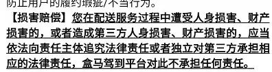 记者调查盒马的相关用户协议发现,其明确规定“在配送服务过程中遭受人身损害、财产损害的,或者造成第三方人身损害、财产损害的,应当依法向责任主体追究法律责任或者独立对第三方承担相应的法律责任,盒马驾到平台对此不承担任何责任。”