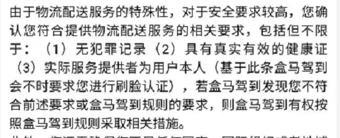 相对来说,众包骑手的门槛较低,会用智能手机和会骑电动车是主要条件,不过有违法记录的,无论专职还是众包,平台都不会聘用。记者调查发现,在盒马驾到的用户协议中,明确指出“由于物流配送服务的特殊性,对于安全要求较高,您确认您符合提供物流配送服务的相关要求,包括但不限于无犯罪记录……”