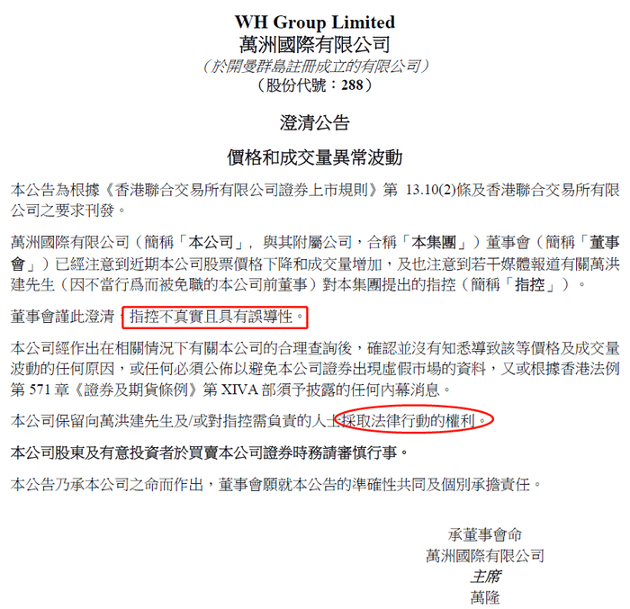 18日中午,万洲国际在港交所发布公告称,董事会谨此澄清,指控不真实且具有误导性。公司保留向万洪建先生/或对指控需负责的人士采取法律行动的权利。