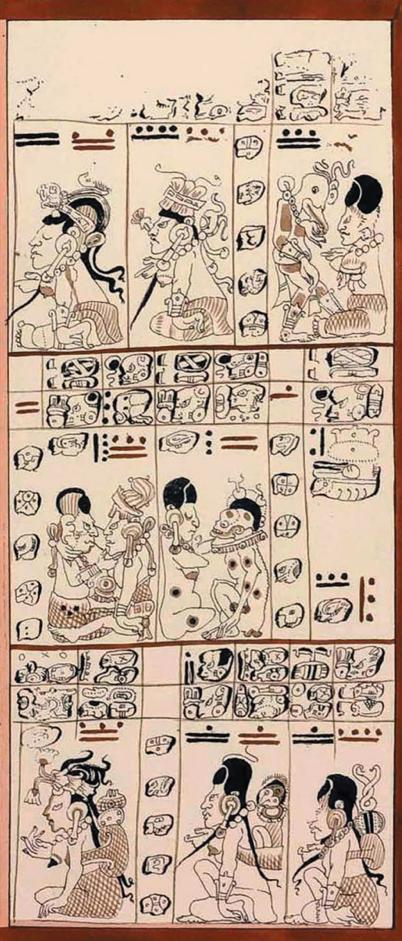 数百万人登上互联网上的阴谋论网站,这些网站警告人们,根据一个5126年的玛雅循环历法,2012年12月23日将是我们已知世界的终结。这里展示了数页《德累斯顿古抄本》(The Dresden Codex)的内容,包含用以计算玛雅循环的天文学和占星术内容。这份抄本是仅存的三份玛雅古抄本之一,而据估计,原来的抄本数量有五千之巨。其余那些抄本在16世纪毁于西班牙宗教当局之手。