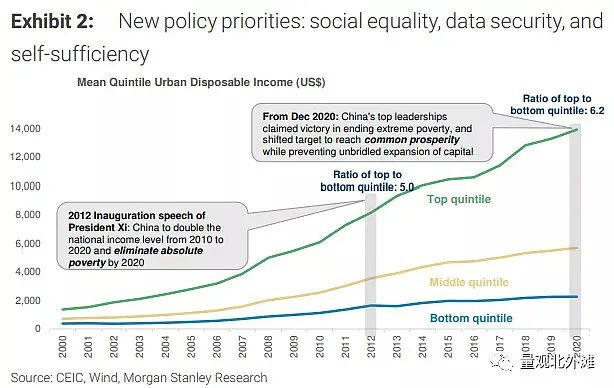 新目标:我们相信近期的监管收紧反应了中国底层逻辑的改变,并不只是针对互联网巨头。在过去十年中,中国的核心目标是保持双位数的收入增速,并消除绝对贫困,给予经济增速以最高权重。