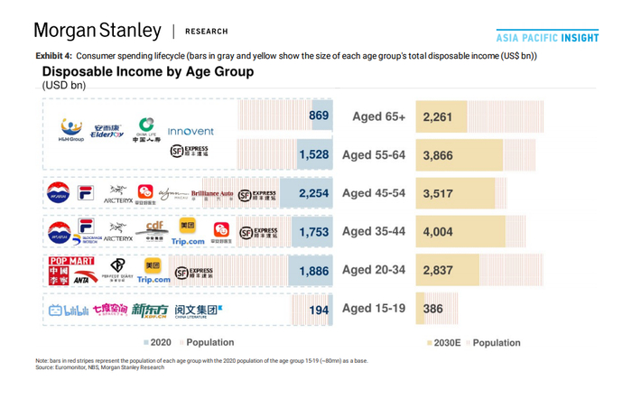 根据摩根士丹利预计,到2030年,中国家庭人均收入将翻一番,而购买力将由35-44岁和55岁以上年龄段(1960年代出生的婴儿潮一代及其子女)主导,此外,到了2030年,消费重点将从现在的“年轻消费者”转向为“家庭需求和退休消费”。