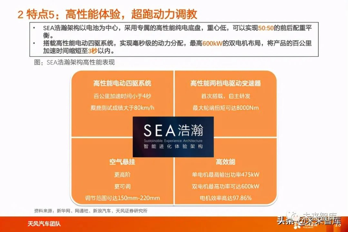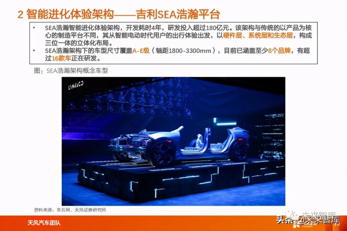 SEA浩瀚智能进化体验架构,开发耗时4年,研发投入超过180亿元。该架构与传统的以产品为核心的制造平台不同,其从智能电动时代用户的出行体验出发,以硬件层、系统层和生态层,构成 三位一体的立体化布局。SEA浩瀚架构下的车型尺寸覆盖A-E级(轴距1800-3300mm),目前已涵盖至少8个品牌,有超 过16款车正在研发。