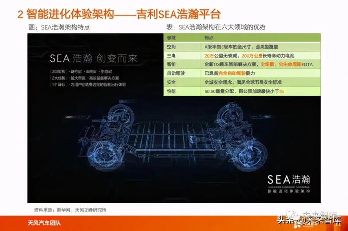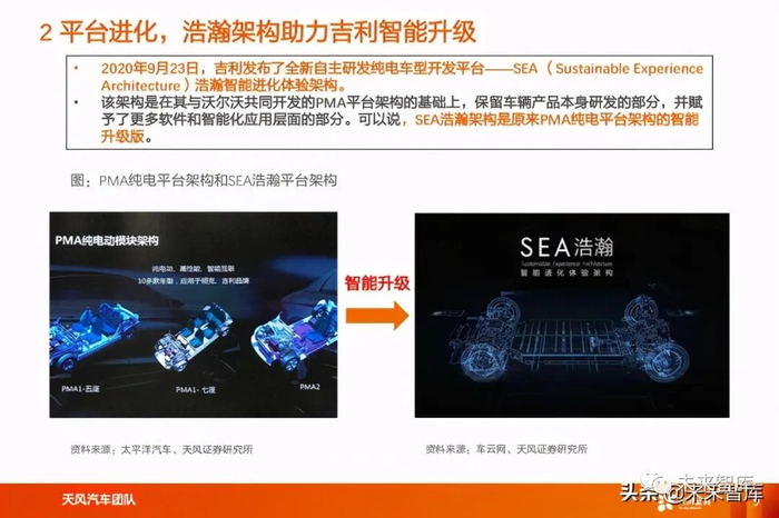 2020年9月23日,吉利发布了全新自主研发纯电车型开发平台——SEA (Sustainable Experience Architecture)浩瀚智能进化体验架构。 该架构是在其与沃尔沃共同开发的PMA平台架构的基础上,保留车辆产品本身研发的部分,并赋 予了更多软件和智能化应用层面的部分。可以说,SEA浩瀚架构是原来PMA纯电平台架构的智能 升级版。