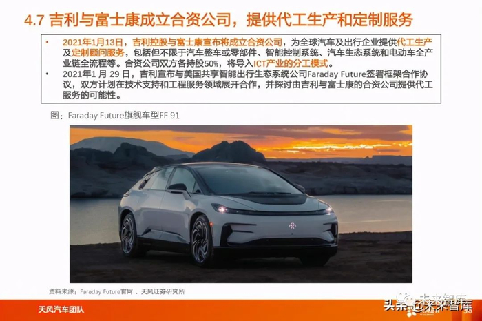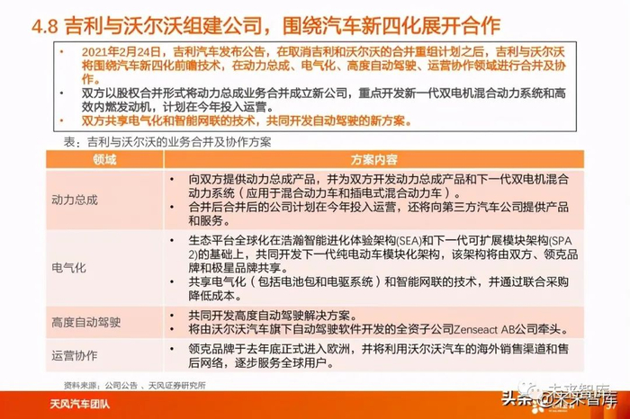 2021年7月3日,吉利汽车发布公告,为发展极氪品牌,极氪集团已订立 CEVT 收购协议、浩瀚能 源收购协议及宁波威睿认购协议,以收购研发、生产及销售电动汽车所需的资产及技术;此外, 极氪还与吉致金融签订合作协议,由吉致汽车金融向极氪零售客户提供汽车融资服务。由此,极氪将具备完整的开发、生产和销售纯电动汽车相关部件和产品能力,包括电动汽车、动力电池和电驱系统及其他汽车部件。
