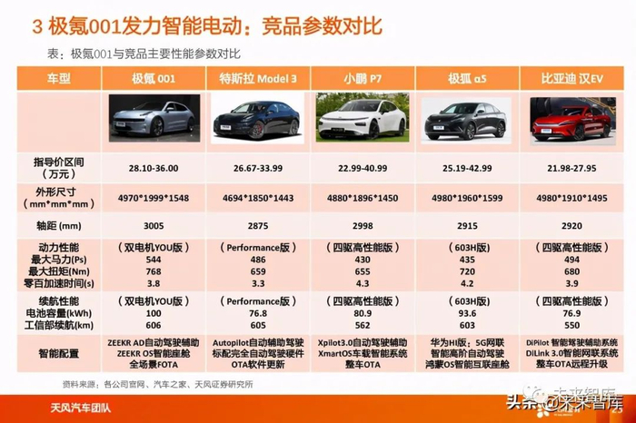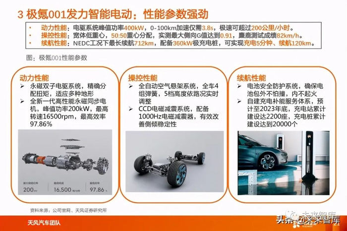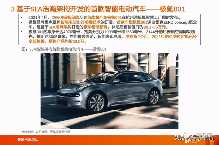 2021年4月,ZEEKR极氪品牌及其首款量产车极氪001在杭州湾极氪智慧工厂同时发布。极氪品牌重点聚焦智能电动出行前瞻技术的研发,首款车型极氪001源自领克ZERO concept概念 车,是基于SEA浩瀚架构打造的豪华猎装轿跑,补贴后售价区间为28.1-36万元。极氪001的车身长达4970毫米,宽高分别为1999毫米和1560毫米,2144升的后备箱空间同级领 先,轴距达3005毫米,性能参数强劲,智能表现亮眼。发布仅2个月,2021年的可交付定单已经 全部售罄,预售产品均价33.5万。