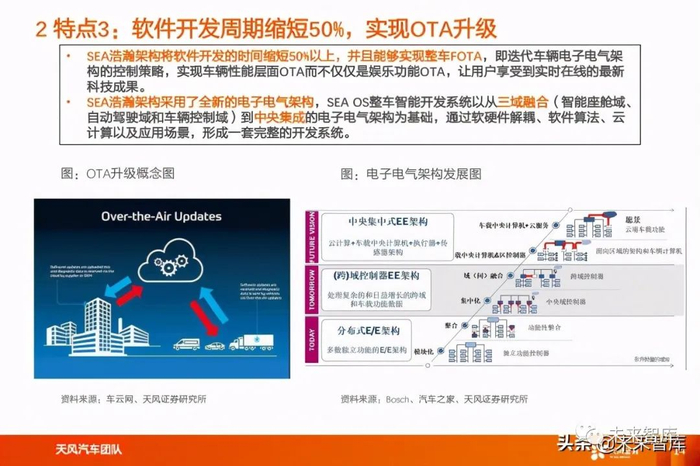 SEA浩瀚架构将软件开发的时间缩短50%以上,并且能够实现整车FOTA,即迭代车辆电子电气架 构的控制策略,实现车辆性能层面OTA而不仅仅是娱乐功能OTA,让用户享受到实时在线的最新 科技成果。SEA浩瀚架构采用了全新的电子电气架构,SEA OS整车智能开发系统以从三域融合(智能座舱域、 自动驾驶域和车辆控制域)到中央集成的电子电气架构为基础,通过软硬件解耦、软件算法、云 计算以及应用场景,形成一套完整的开发系统。