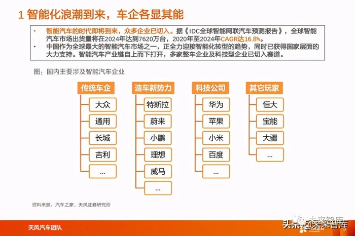 智能汽车的时代即将到来,众多企业已切入。 中国作为全球最大的智能汽车市场之一,正全力迎接智能化转型的趋势,同时已获得国家层面的 大力支持。智能汽车产业链自上而下打开,多家整车企业及科技型企业已切入赛道。