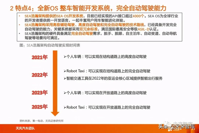 SEA浩瀚架构提供的SEA OS开发系统,目前已经实现的API接口超过4000个。SEA OS为全球行业 的开发者提供统一开发语言,一起丰富用户用车智能进化体验。SEA浩瀚架构采用高级辅助驾驶、高度自动驾驶和完全自动驾驶的技术路线,已经具备开发完全 自动驾驶的能力,关键系统都采用双冗余标准,满足国际最高安全等级ASIL-D认证。SEA浩瀚架构的硬件具备满足完全自动驾驶需求,脱手、脱眼、自主泊车、自动变道、自动导航 驾驶等场景均可满足。