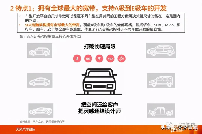 车型开发平台的尺寸带宽可以保证不同车型在用共同的工程方案解决关键尺寸时能在一定范围内 的浮动。SEA浩瀚架构拥有全球最大的带宽,覆盖A级车到E级车的全部规格,包括轿车、SUV、MPV、旅 行车、跑车、皮卡等全部车身造型,体现了SEA浩瀚架构对于不同车型开发的包容性。