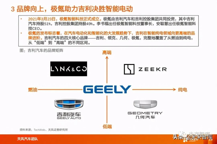 极氪的发布标志着,在汽车电动化和智能化的大发展趋势下,吉利在智能纯电领域向更高端的品 牌进阶。吉利汽车的四大核心品牌——吉利、领克、几何、极氪,完整地覆盖了从燃油到纯电, 从“低端”到“高端”的不同区间。
