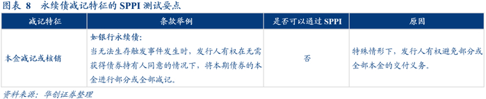 商业银行发行的永续债本质上是一类资本补充工具,通常会设计减记条款以在无法生存事件发生时首先保全资本,但这也赋予了在特殊情形下,发行人避免交付部分或全部本金的权利,因此具有减记条款的永续债(如银行永续债基本均包含减记条款)无法通过SPPI测试。