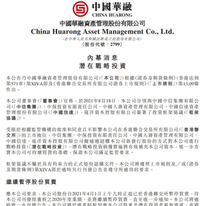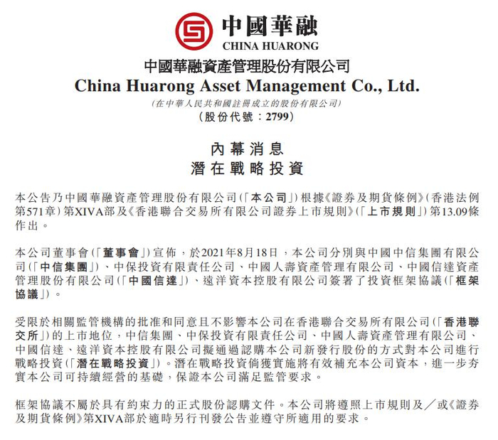 中国华融新闻发言人表示,公司于2021年8月18日分别与中国中信集团有限公司、中保投资有限责任公司、中国人寿资产管理有限公司、中国信达资产管理股份有限公司、远洋资本控股有限公司签署了投资框架协议。上述机构拟通过认购我公司新发行股份的方式对公司进行战略投资。潜在战略投资倘获实施将有效补充公司资本,进一步夯实公司可持续经营的基础,保证公司满足监管要求。