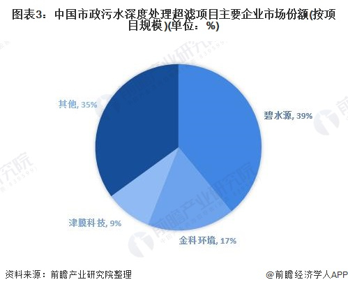 市政污水深度处理超滤项目碧水源、金科环境、津膜科技的市占率分别为39%、17%、9%;市政污水深度处理MBR项目碧水源、金科环境的市占率分别为47%、1%;市政和工业园区污废水深度处理及再生水回用双膜法(超滤+纳滤反渗透)项目碧水源、金科环境、津膜科技的市占率分别为14%、27%、26%。